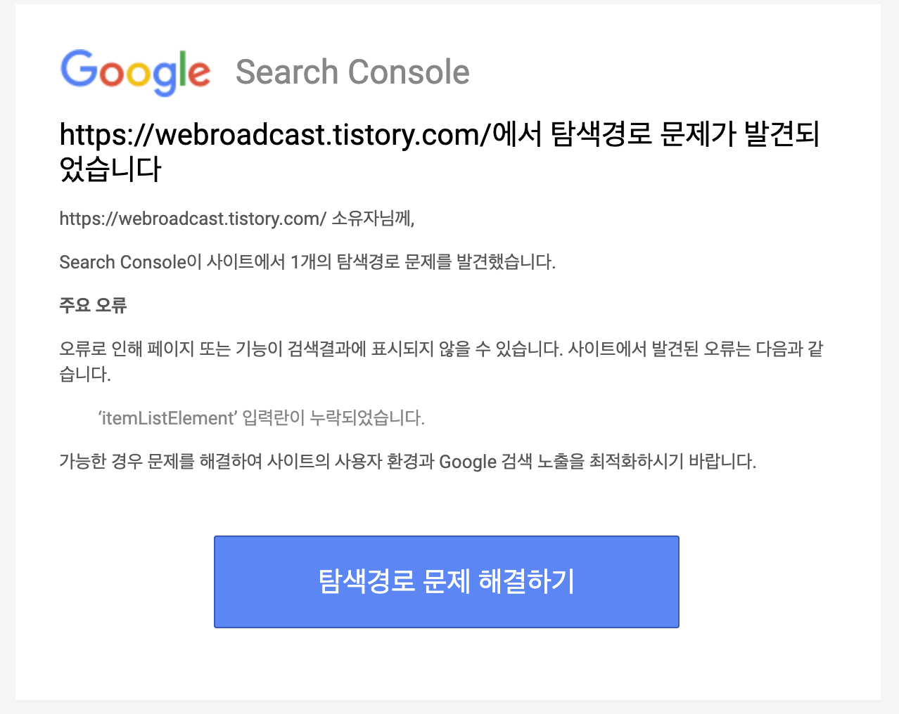 https://webroadcast.tistory.com/ 소유자님께,Search Console이 사이트에서 1개의 탐색경로 문제를 발견했습니다.주요 오류오류로 인해 페이지 또는 기능이 검색결과에 표시되지 않을 수 있습니다. 사이트에서 발견된 오류는 다음과 같습니다.‘itemListElement’ 입력란이 누락되었습니다.가능한 경우 문제를 해결하여 사이트의 사용자 환경과 Google 검색 노출을 최적화하시기 바랍니다.탐색경로 문제 해결하기