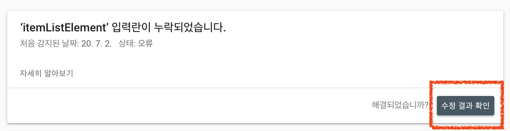 사이트의 문제 탐색경로가 해결된 것으로 확인되었습니다. 확인된 문제는 '‘itemListElement’ 입력란이 누락되었습니다.'입니다.