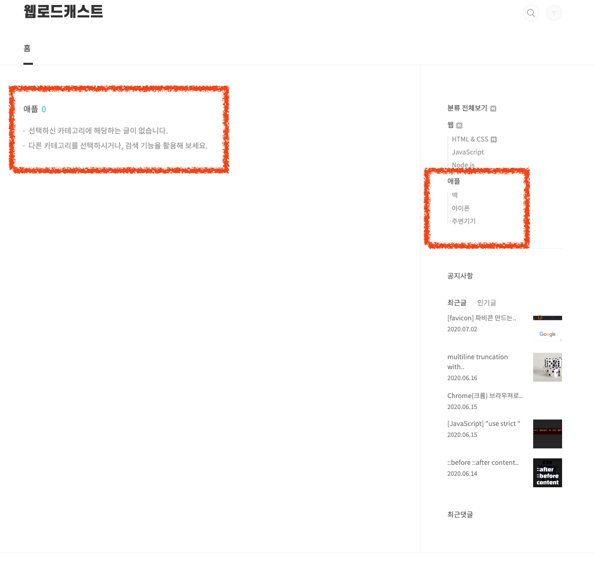애플 카테고리를 눌렀을 때 카테고리는 존재하지만 글이 존재하지 않는다.