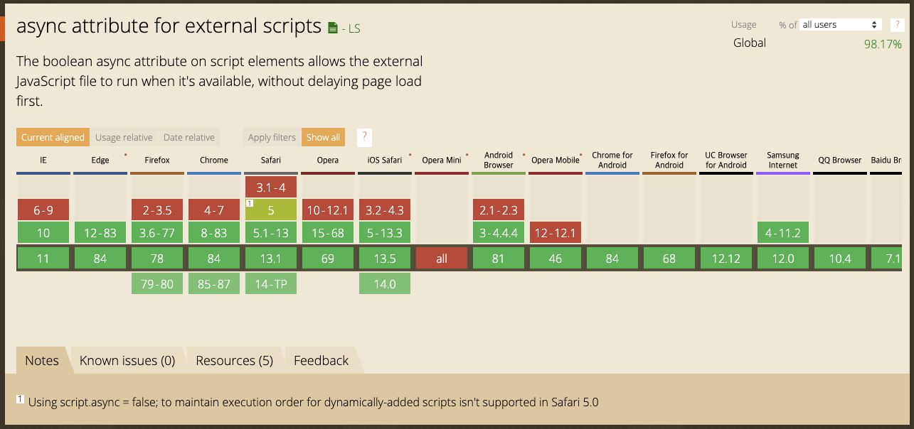 async 속성은 IE10 이상부터 지원하고 대부분의 브라우저이서 지원한다.