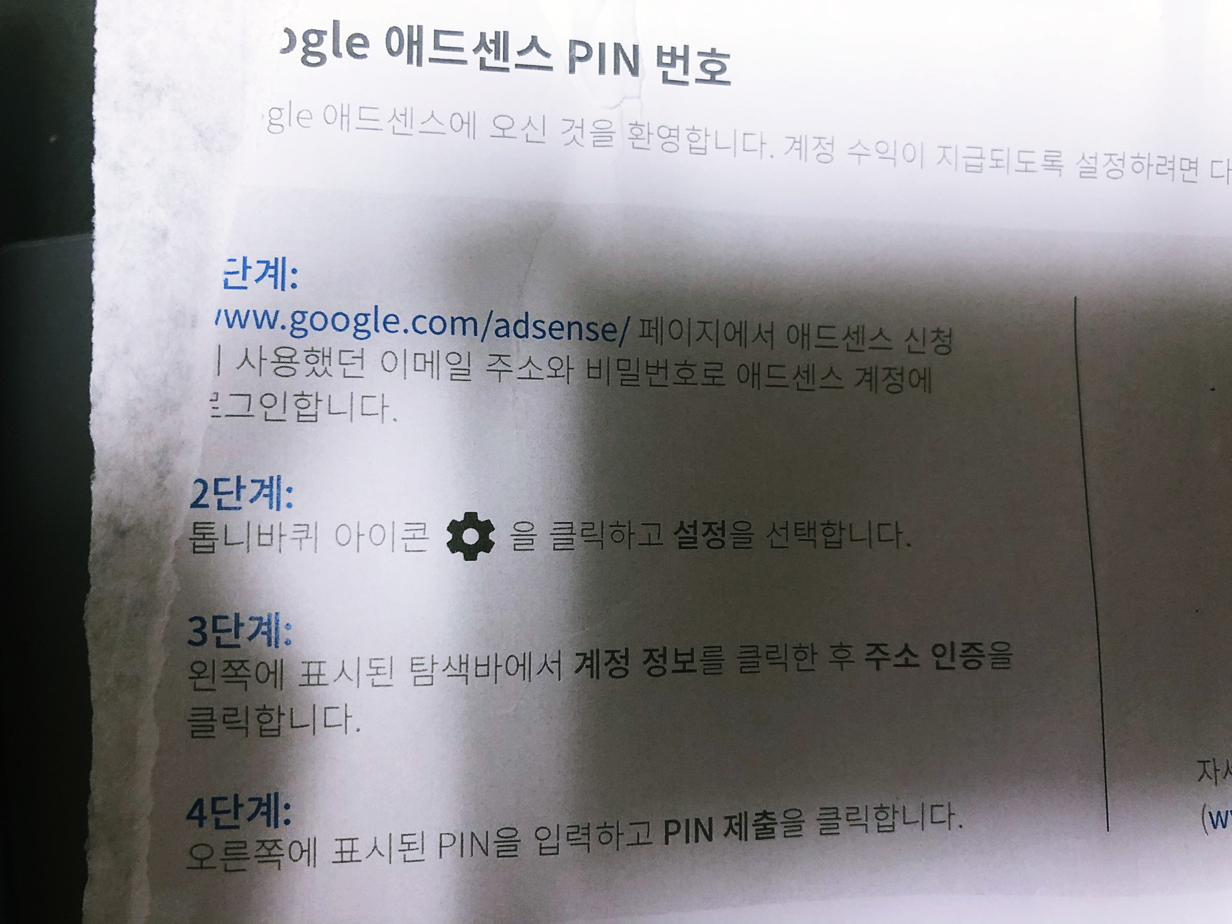 우편물에는 Google 애드센스 PIN 번호라며 계정 수익이 지급되도록 설정하려면 다음 단계를 따르라며 설명이 나와있다.