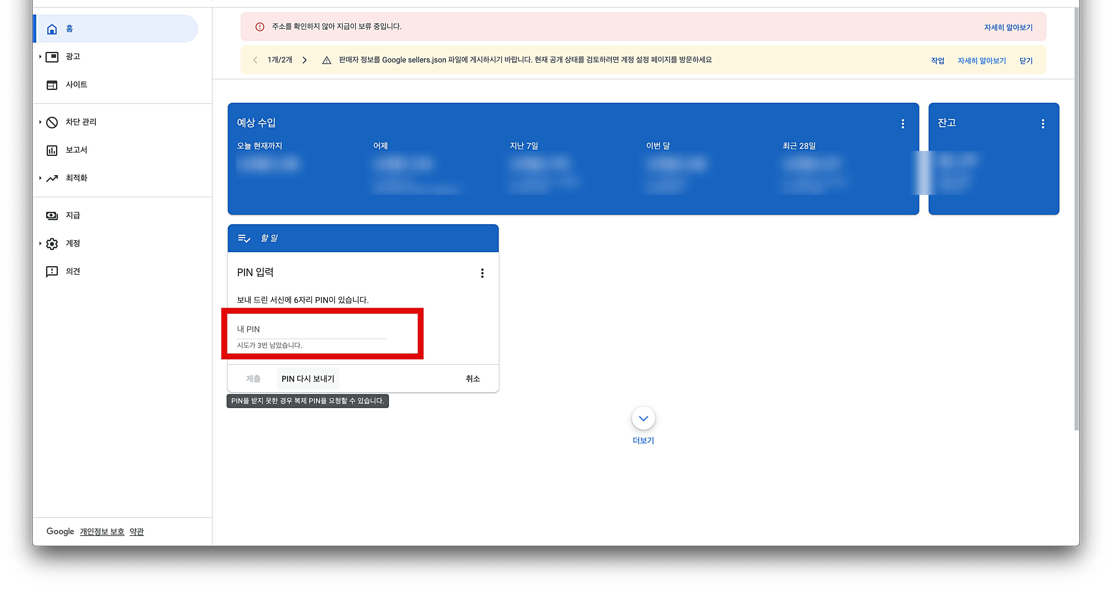 맨 위에 빨간색 notification으로 '주소를 확인하지 않아 지급이 보류 중입니다.' 라고 떠있는데 이게 바로 pin 번호를 입력하면 사라지게 된다.