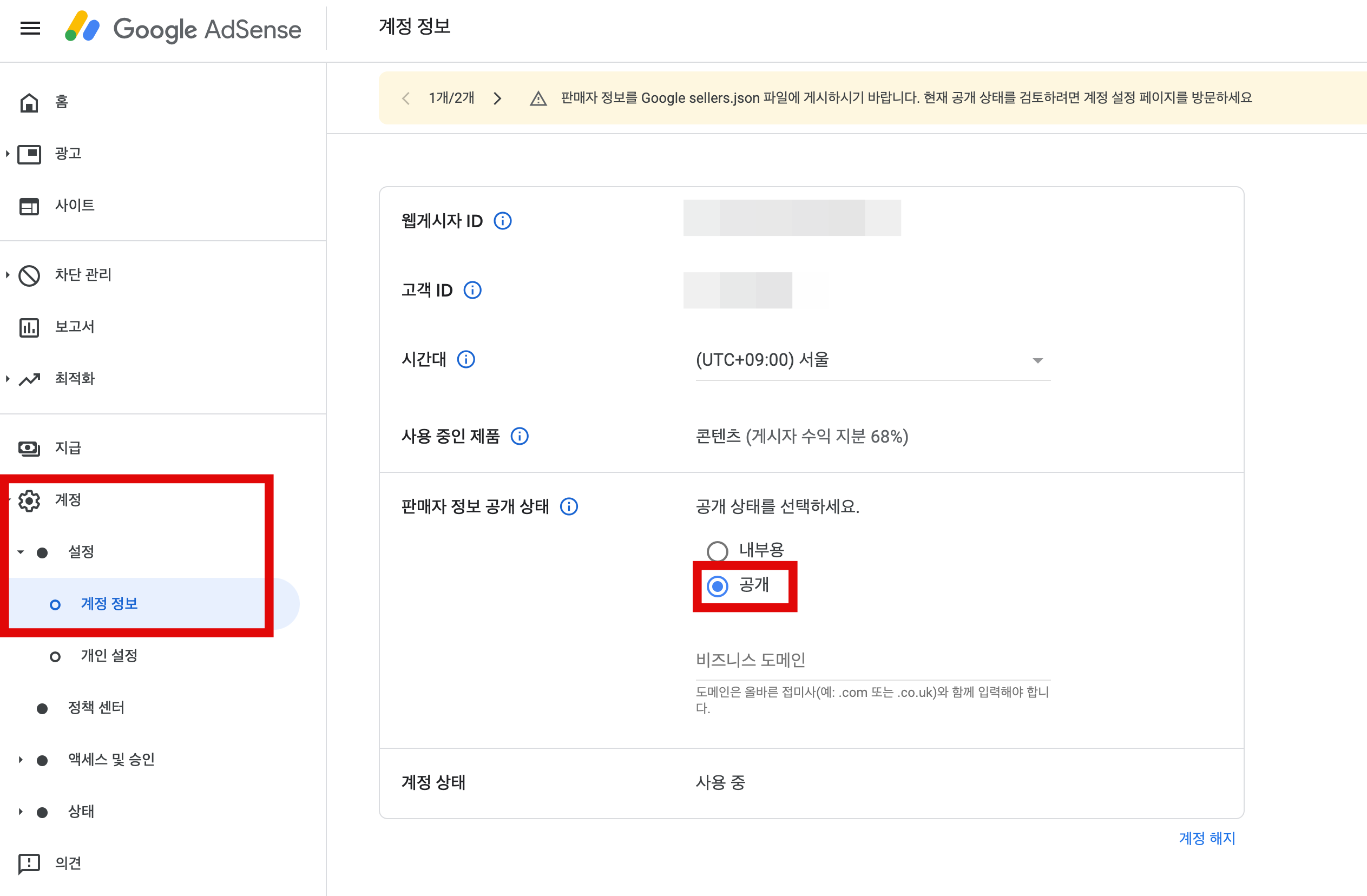 판매자 정보를 Google sellers.json 파일에 게시하시기 바랍니다. 현재 공개 상태를 검토하려면 계정 설정 페이지를 방문하세요