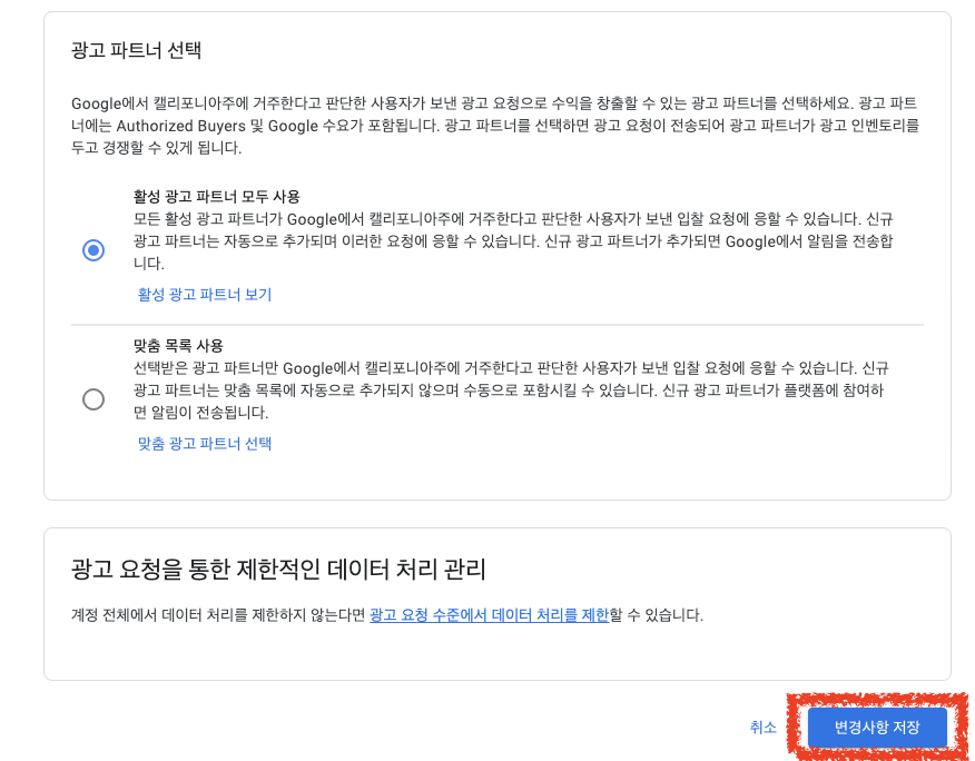 - 활성 광고 파트너 모두 사용