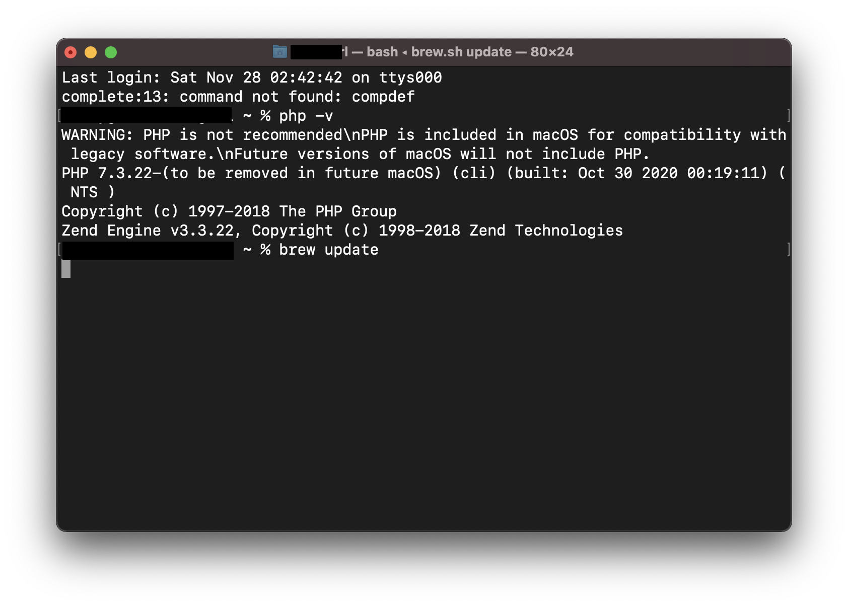 WARNING: PHP is not recommended\nPHP is included in macOS for compatibility with legacy software.\nFuture versions of macOS will not include PHP.