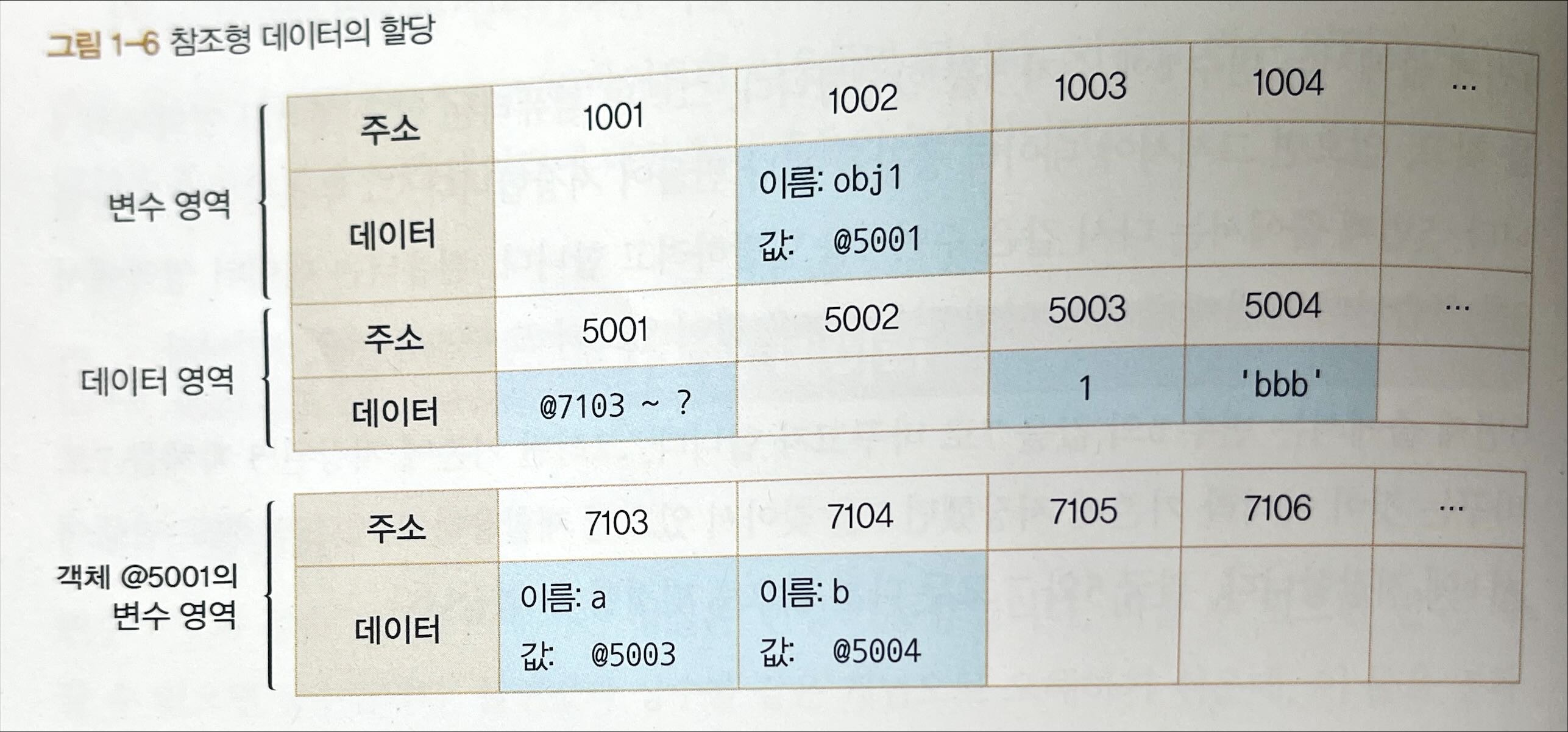 - 변수영역 : 메모리 @1002에 변수 obj1을 값으로 메모리 @5001을 저장